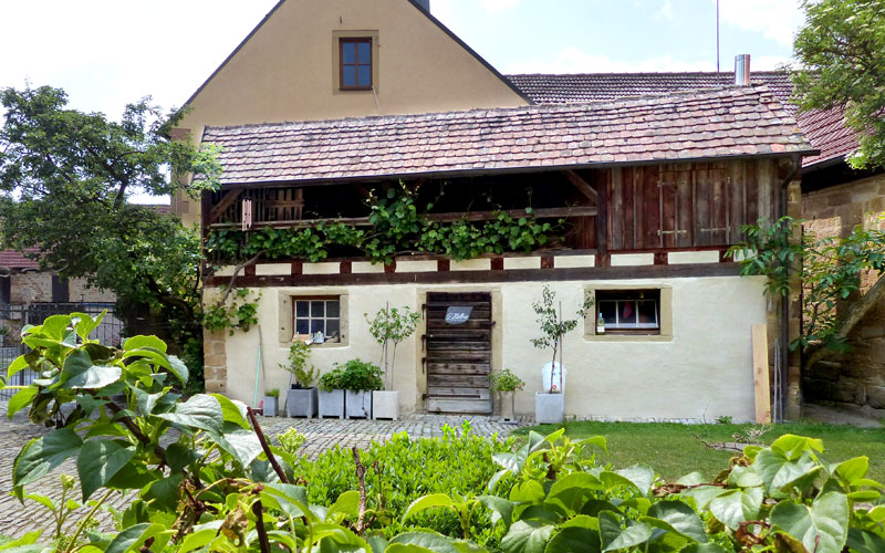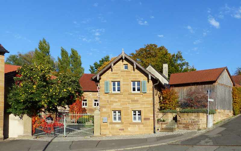 Der ursprünglich erhaltene, über die Jahrhunderte komplett in lokalem Sandstein errichtete, fränkische 4-Seit-Hof liegt im Dreieck mit dem Fuchs’schen Barockschloß und der Dorfkirche im Ortskern von Bimbach, einem Ortsteil der Stadt Prichsenstadt.